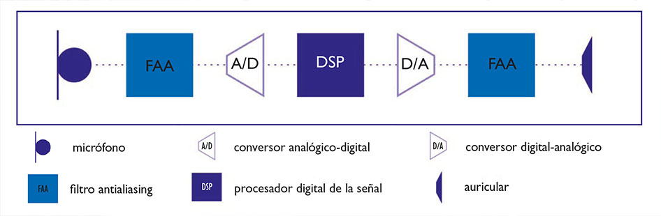 La presión sonora es convertida por el micrófono en una corriente eléctrica que es limpiada por el filtro antialiasing. Posteriormente el audífono transforma dicha señal en digital (0 y 1), que es procesada a nuestro antojo por el DSP y nuevamente enviada a un filtro antialisasing. A continuación se transforma de nuevo la señal digital en analógica y lo envía finalmente al auricular para convertirla en presión sonora, amplificada y procesada según las necesidades de nuestros pacientes.