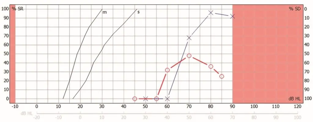 Este fenómeno suele estar relacionado con lesiones retrococleares (Katz[2] et al, 2017). En estos casos, se observa que, después de alcanzar el nivel máximo de discriminación, el porcentaje de palabras correctamente identificadas comienza a disminuir a medida que aumenta la intensidad de la señal presentada.