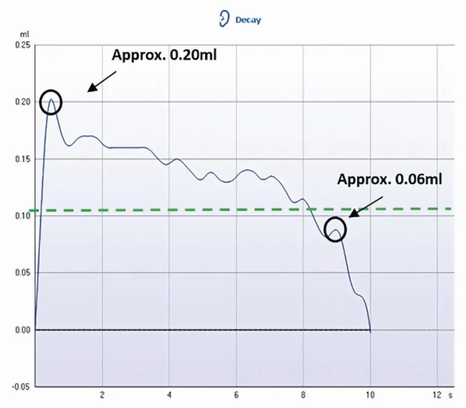 Prueba de fatiga de reflejo positiva. El reflejo decae más del 50% tras 10 segundos de presentación del estímulo. © Imagen: interacoustics.com