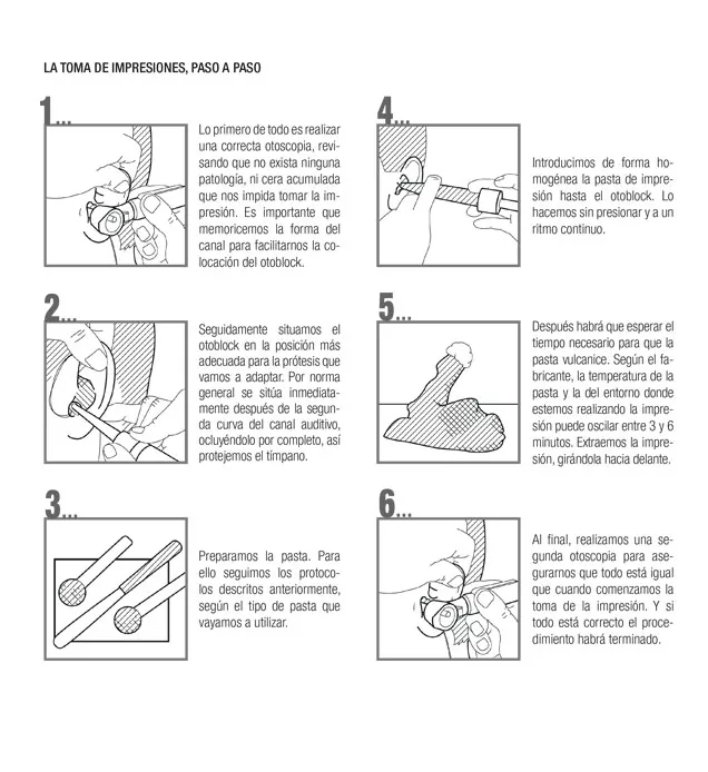 La mejor manera de asegurarnos de que estáis cumpliendo correctamente con el procedimiento de la toma de impresiones pasa por presentároslo visualmente. Así podréis ver, paso a paso y de una manera más gráfica, la secuencia de trabajo a la hora de tomar medidas al conducto auditivo de los pacientes.