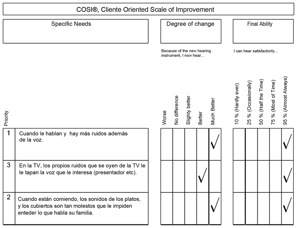 COSI es un cuestionario de evaluación que permite documentar las necesidades de la persona con relación a su capacidad auditiva. Se pidió al paciente que enumerara las situaciones más relevantes en su vida que se veían condicionadas por su dificultad auditiva.