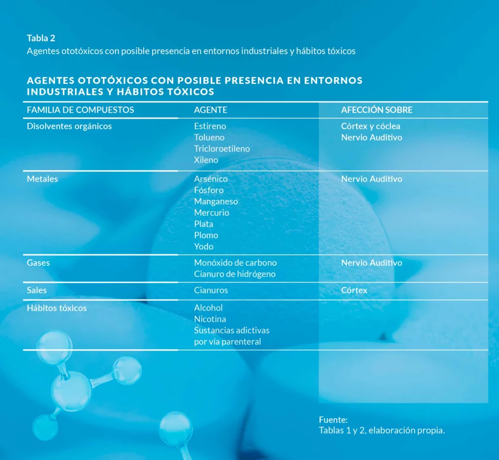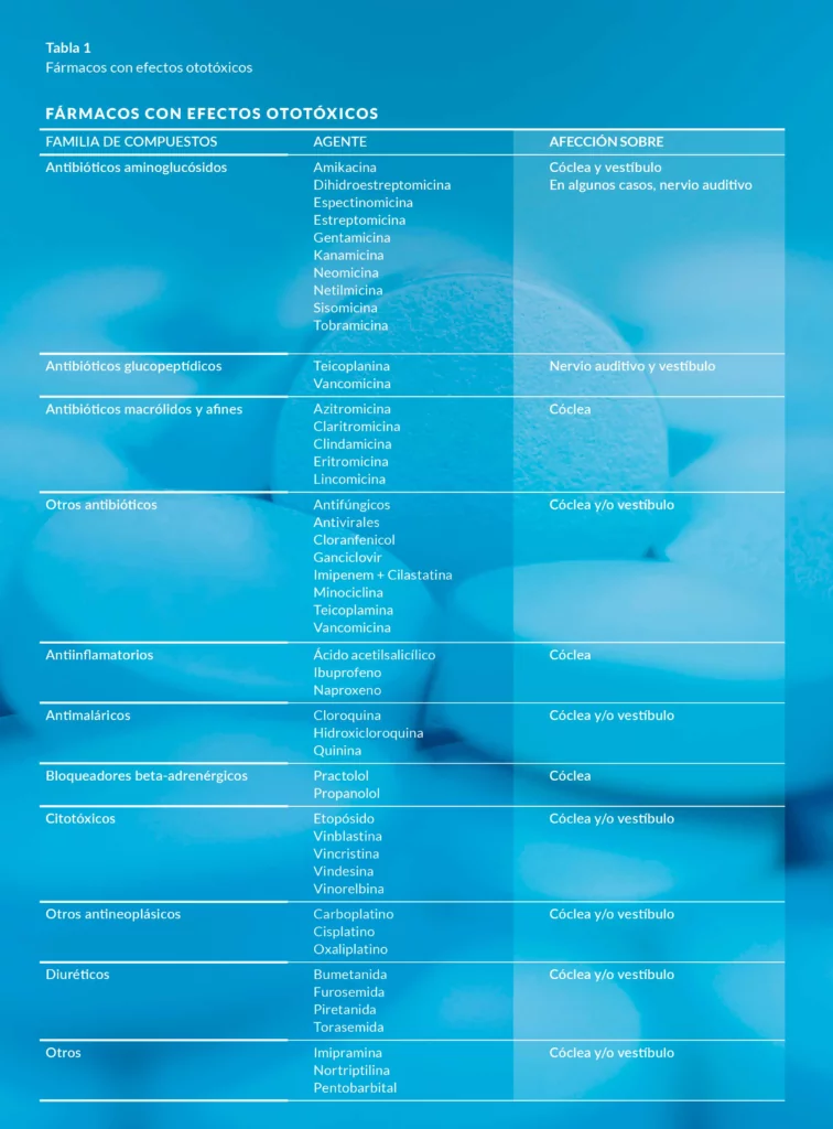 Las tablas 1 y 2 recopilan algunos de los fármacos y sustancias ototóxicas más comúnmente usados. Existen muchas sustancias más que no están en las tablas por tener un uso menos frecuente, y seguramente existan otras muchas sustancias perjudiciales para el oído que aún no han sido detectadas o estén todavía en proceso de estudio.