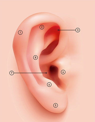 1 Hélix / 2 Fosa escafoidea / 3 Fosa triangular / 4 Trago / 5 Lóbulo/ 6 Antitrago/ 7 Meato/ 8 Antihélix