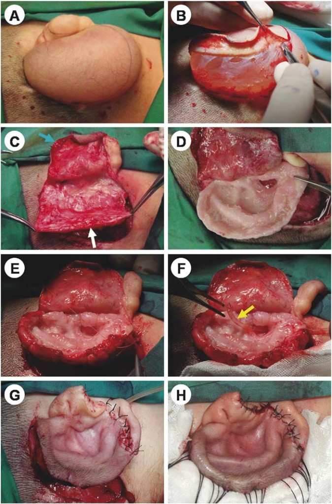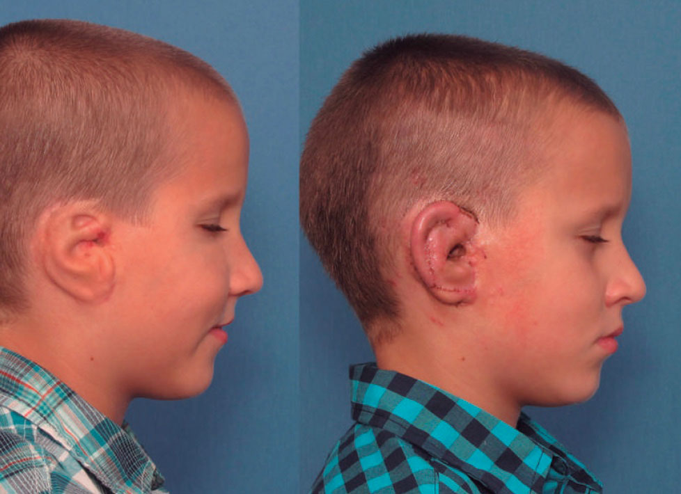 Como en estos casos no hay pérdida del trago y el conducto auditivo externo ya está, la reconstrucción se limita a dos tiempos quirúrgicos. En algunas ocasiones existe el lóbulo, que puede rotarse en el primer tiempo quirúrgico, en el momento de la implantación del marco de cartílago.