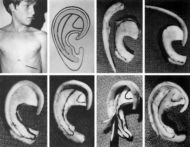 La primera etapa incluye dos procedimientos: obtener cartílago sano de las costillas y luego insertar dicho cartílago preparado en un bolsillo de piel debajo de la oreja deformada o dañada.