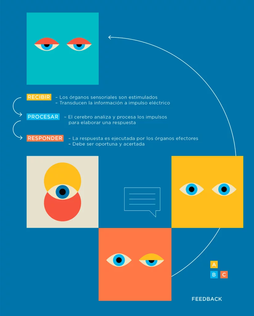 Sea cual sea la tarea propuesta, visual o auditiva, siempre hay un receptor sensorial, una vía neuronal aferente de entrada de la información y su procesamiento en el sistema nervioso central, y una vía eferente de la información hacia los órganos efectores encargados de realizar la acción según la planificación motora prevista.