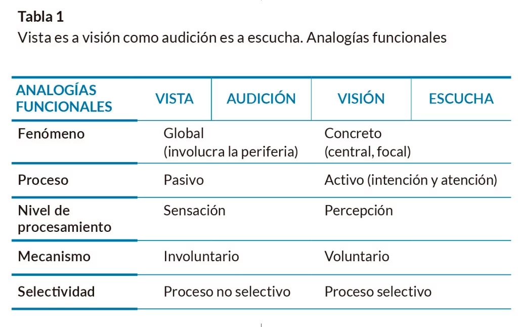 Vista es a visión como audición es a escucha. Analogías funcionales