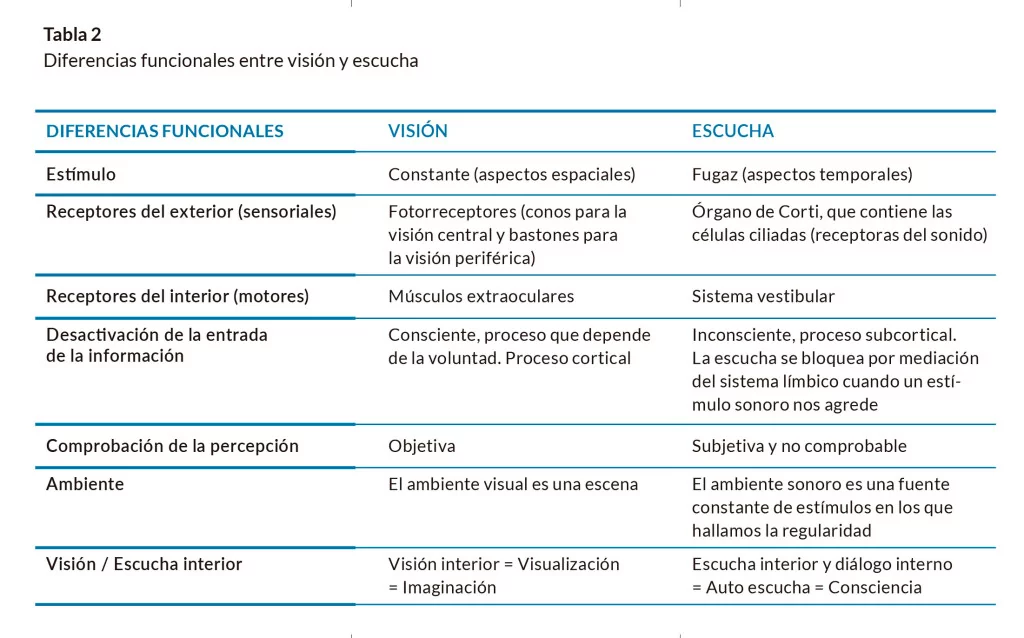 Por otro lado, entre la «visión» y la «escucha» hay unas diferencias importantes, que los hacen procesos complementarios (tabla2).
