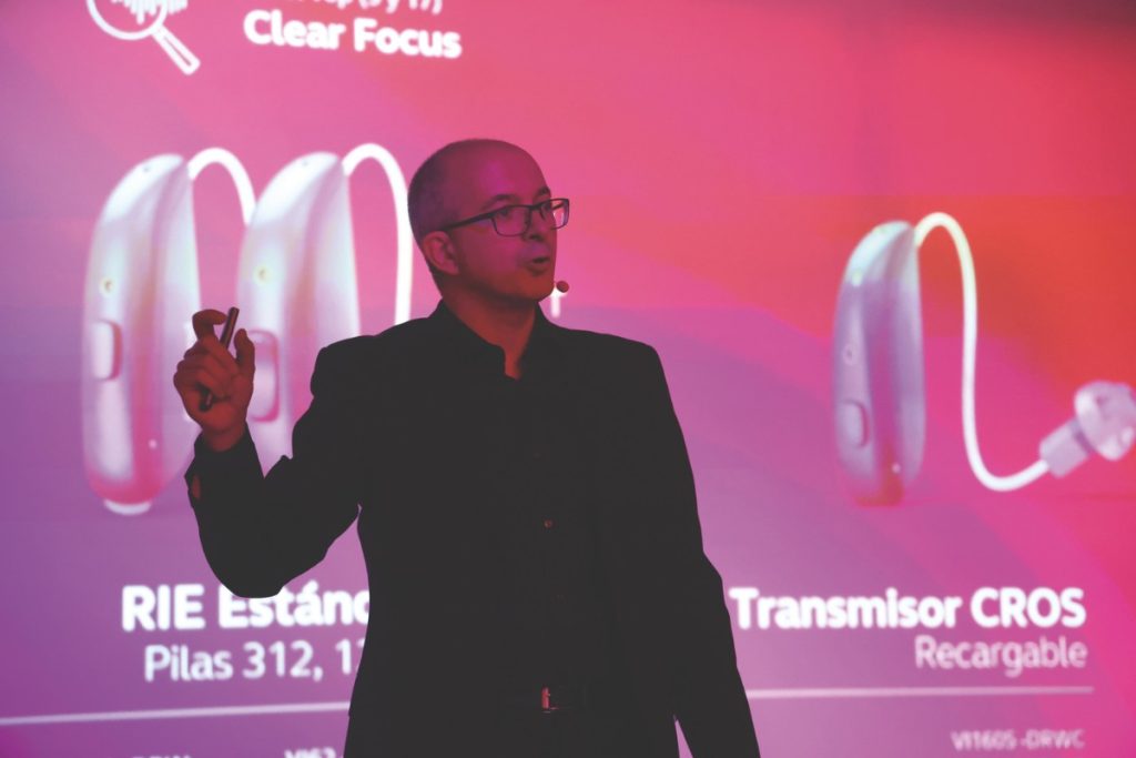 La propuesta de GN fue clara: mostrar que la tecnología auditiva más puntera no solo mejora la audición, sino que lo hace sin renunciar a la sensibilidad, a la emoción, a la vida misma. En un entorno cuidadosamente ambientado, los participantes recorrieron ambas salas. En el escenario de arriba, «Sentir», con Manuel Yuste, director de Producto de Grupo GN España presentando los nuevos productos entre cielos azules y un ambiente naíf que culminó con la irrupción de un coro góspel en directo, que previamente había sido escuchado en una demostración. Abajo, «Vivir» con Miguel Aranda, Product Marketing Manager en ReSound, desvelando las novedades de ReSound y Beltone en un escenario de pasión y potencia, con el sonido de una Harley Davidson atravesando literalmente la sala y dejando el característico olor a gasolina, para demostrar las capacidades de filtrado en entornos extremos.