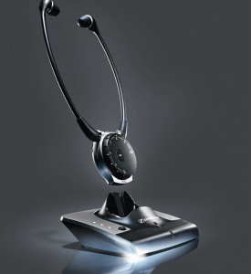 FT: Nuestros principales sets de ayuda auditiva son stethosets o auriculares en forma de estribo, con sonido estéreo, que transmiten y reciben inalámbricamente el sonido, bien sea por radio-frecuencia (mayor cobertura) o por infra-rojo (menor cobertura y mayor calidad).