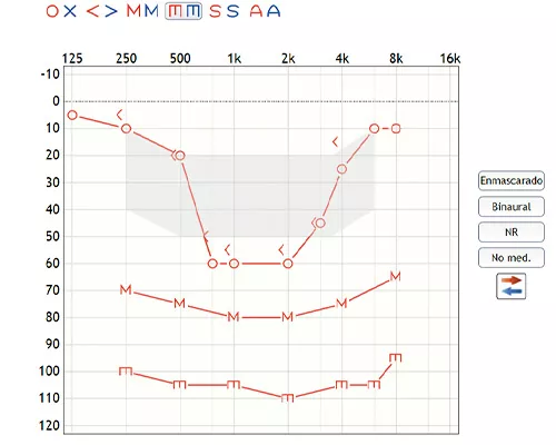 Estos audiogramas se caracterizan por la recuperación de valores audiométricos normales en los extremos y el descenso de umbrales en las frecuencias intermedias.