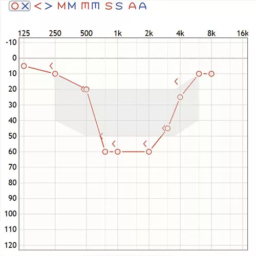 La audiometría tonal es la prueba de referencia para medir la capacidad auditiva de una persona. No solo permite conocer el grado de dificultad auditiva. La forma de su curva también puede aportar información relevante sobre la etiología de la pérdida como ocurre con el Síndrome de Menière y su característico descenso en frecuencias bajas o la muesca de Carhart en la frecuencia 2000Hz en casos de otosclerosis. La HFM es de carácter neurosensorial y generalmente se asocia factores genéticos, transmitida en patrón autosómico dominante. Puede ser congénita o desarrollarse de forma progresiva.