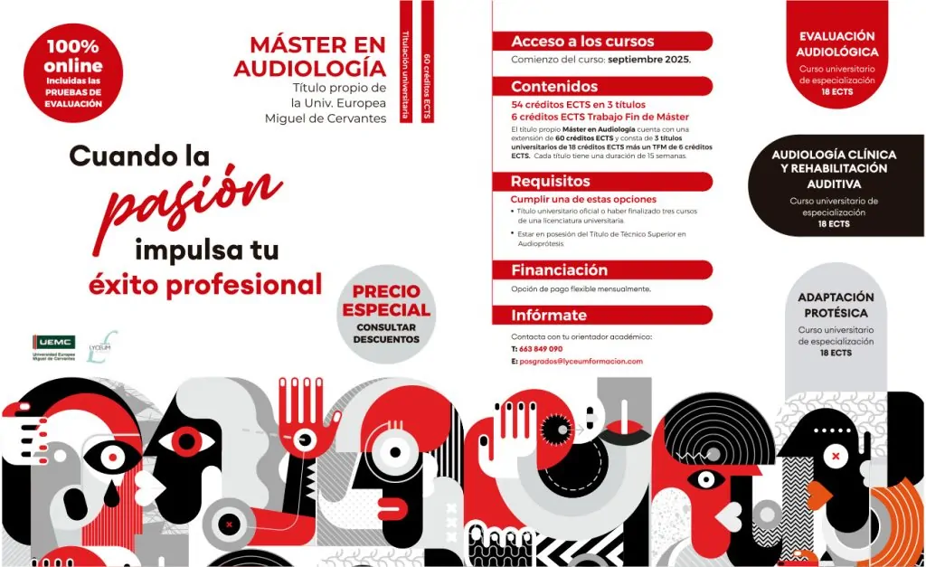 ⇢ El Máster en Audiología está dirigido a todos los Técnicos Superiores en Audioprótesis y profesionales de la Audiología que deseen obtener una amplia y exhaustiva formación. Está enfocado a la especialización en todos los ámbitos de la Audiología, una mejora imprescindible en la actualidad para la atención del paciente con hipoacusia. Se compone de títulos propios certificados por la Universidad Europea Miguel de Cervantes, que ofrece en su Facultad en Ciencias de la Salud una sólida formación teórico / práctica y una amplia preparación de profesionales en el sector sanitario.